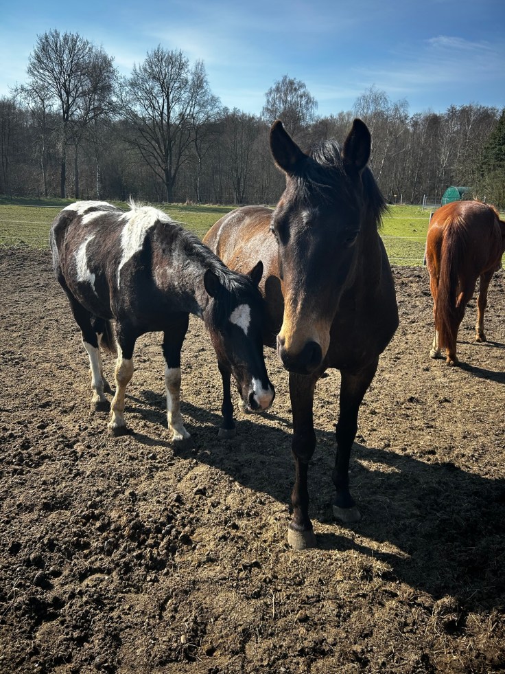 Wir sind heute mit Imani und Finn einmal um den Block gegangen. Imani war anfangs ziemlich lieb. Aber Jacob hat sich mega aufgeregt ist auf und ab galoppiert und hat nach ihm geschrien. Beklopptes Pony! Caya hat nur 2 mal gerufen, ist ruhig am Heu stehen geblieben und war auch entspannt als wir zurück auf dem Hof waren. Zum Glück war Finn auch ziemlich entspannt, da Imani zwischenzeitlich ziemlich aufgedreht war. Aber wir sind einmal rum gekommen.