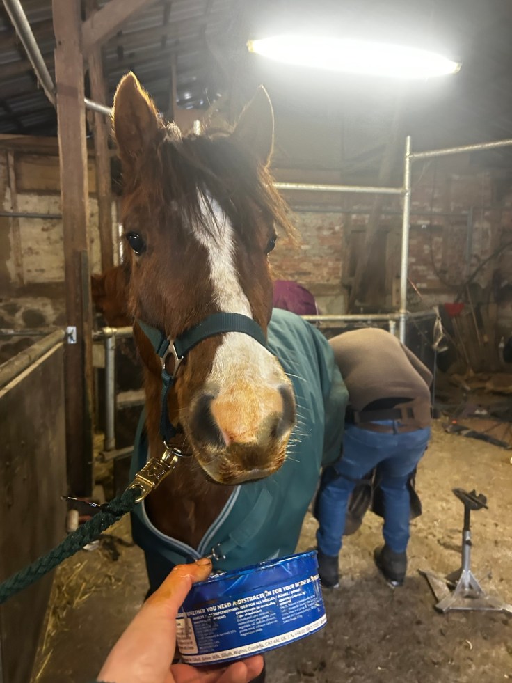 Die Hormone sind raus und wir hatten einen richtig entspannten Schmied Termin. Er war voll brav. Hinten noch nicht gerne, aber bei weitem nicht mehr so schlimm!! Diese Leckschalen sind übrigens der Renner. Man sieht anschließend aus wie ne Sau, aber die sind so richig beliebt bei den Pferden und die stehen super still beim Schmied.