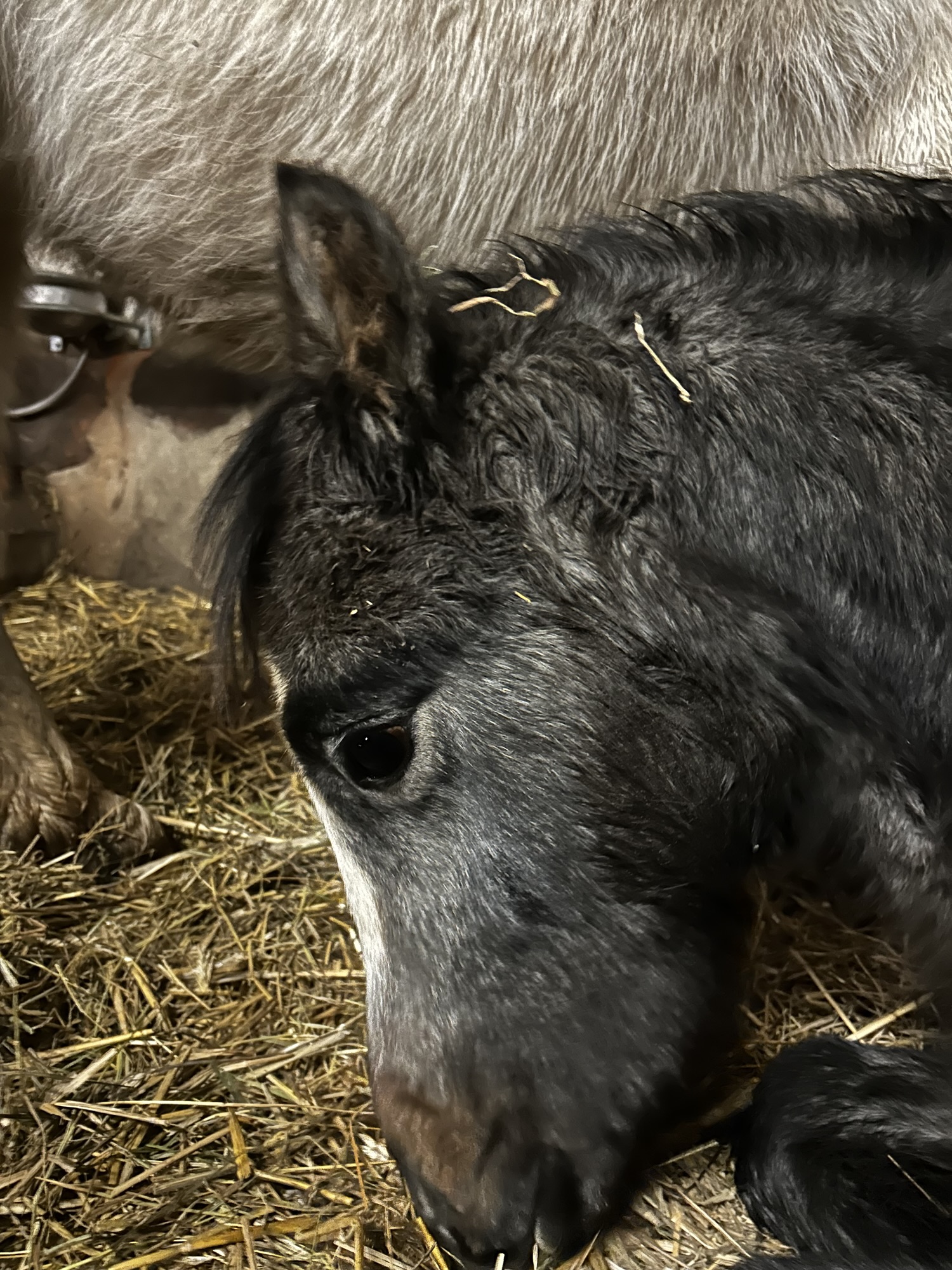 Dieser kleine Stern ist total überrschend am 16.05.2025 gelandet. Wir sind so verliebt. Ich war die ganze Nacht Wach und habe mit Kamera in Cayas Box gestarrt. Leider die falsche. Emilia sah am Abend noch überhaupt nicht so aus, als wenn wir ein Fohlen bekommen. Außerdem kam Haku auch 6 Tage zu früh, wärend Caya jetzt schon 6 Tage drüber ist. Jedenfalls habe ich Freitag gefüttert und abgeäppelt, selbst gefrühstückt und erst als ich alle raus schmeißen wollte, habe ich gemerkt, dass ein Pferd zu viel in der Boß ist. Er ist zuckersüß und ich bin mir ziemlich sicher, dass wir einen kleinen Schimmel bekommen.