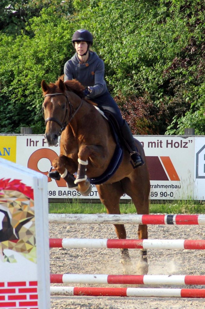 Wie ein Dressurpferd ist er gesprungen! Immer ruhig, immer händelbar und ganz gleichmäßig. Perfekt für jemanden der die letzten 7 Jahre nur noch Cavalettis überwunden hat. Leider war Ende 2012 bei der L-Dressur für Renni Schluss wegen eines kaputtem Kniegelenks. Dies beendete dann auch unsere „Springkarriere“.
