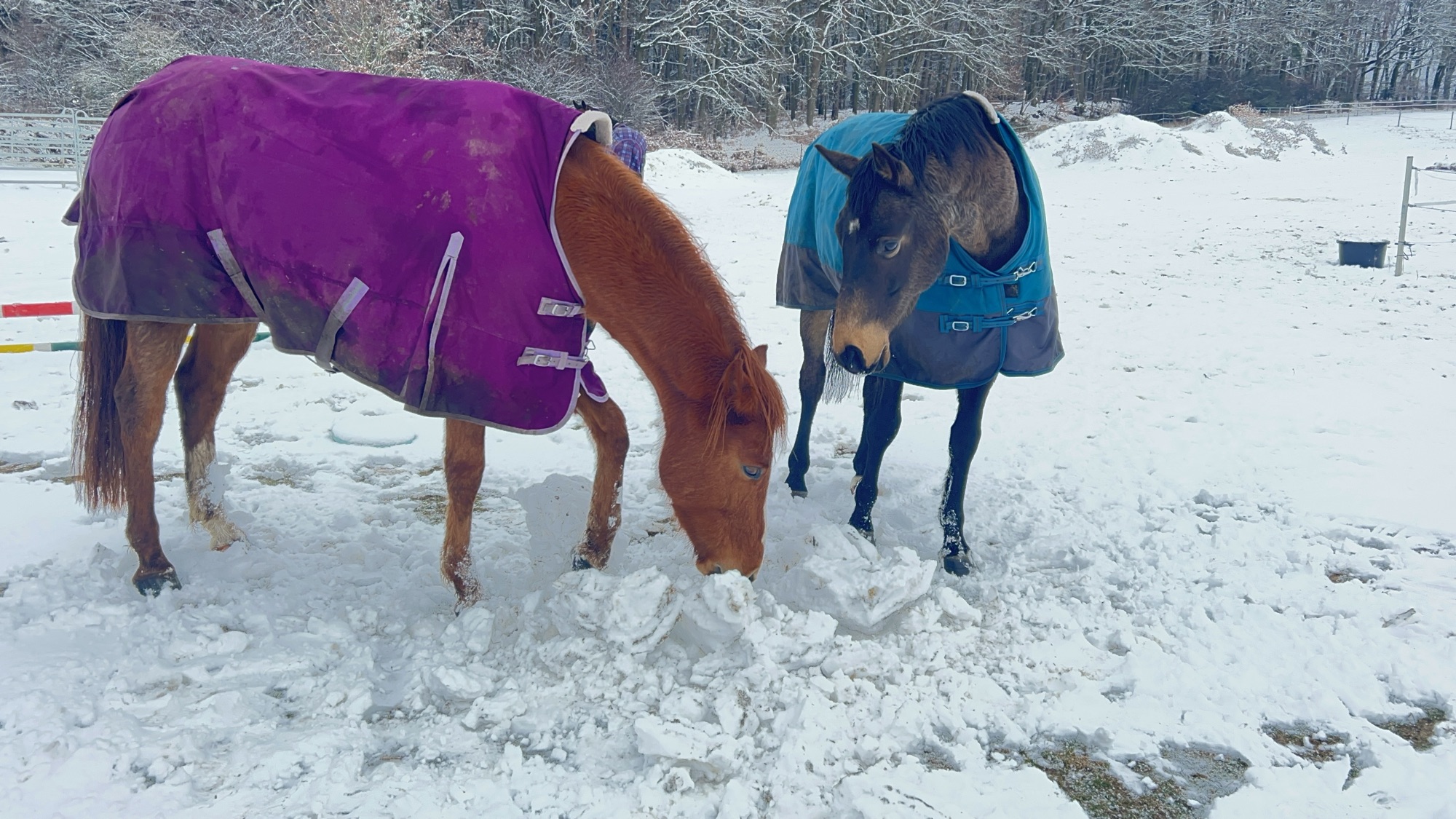 Ich habe einen Schneemann gebaut und die Beiden haben ihn vernichtet. Die haben so viel Langeweile!! Er möchte jetzt immer mit draußen rum laufen. Allerdings kommt er dann auf den Hof und ärgert die Ponys. Es wird echt Zeit, dass der auch mit im Unterricht läuft. Dann hat er was zu tun.