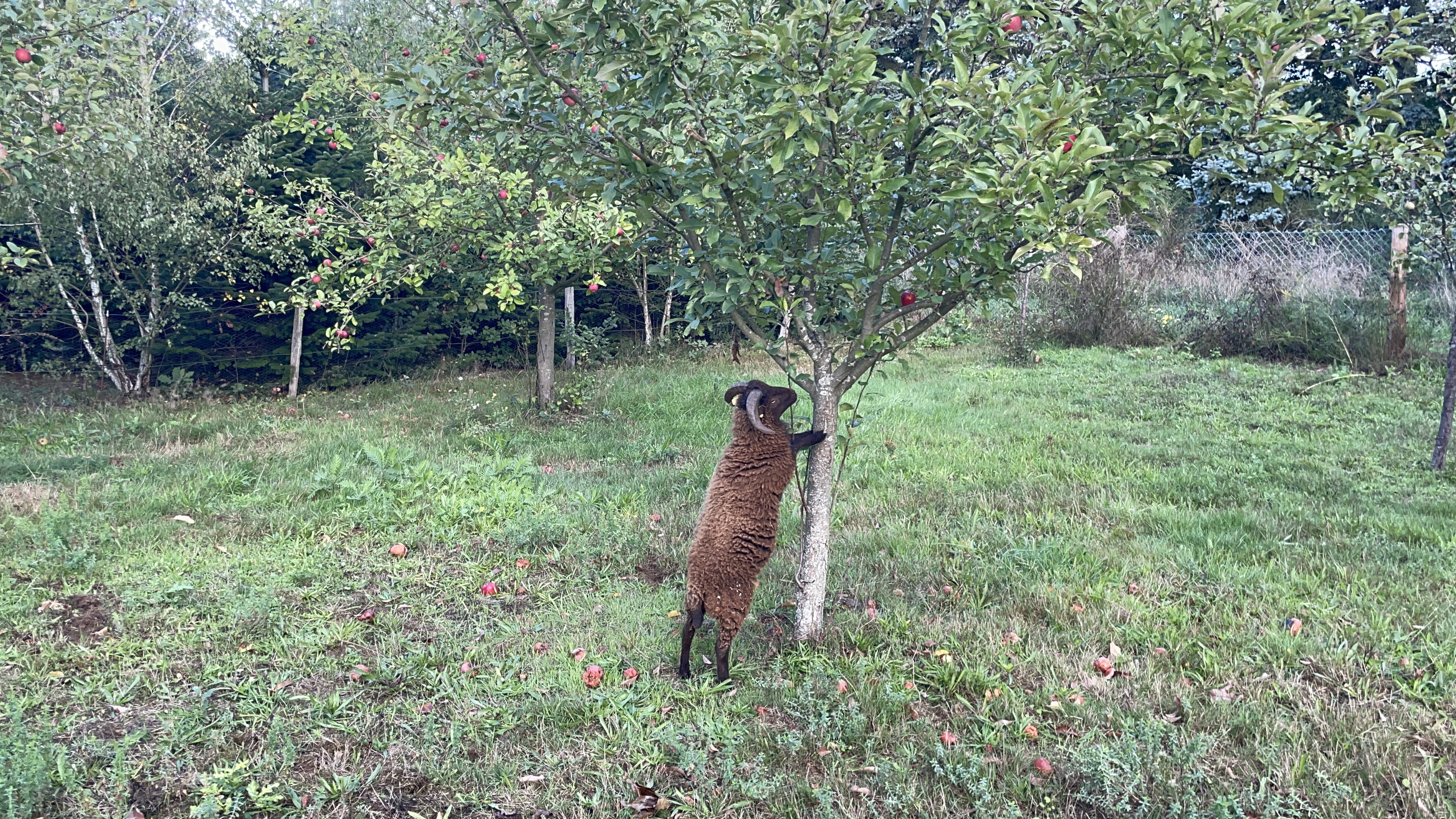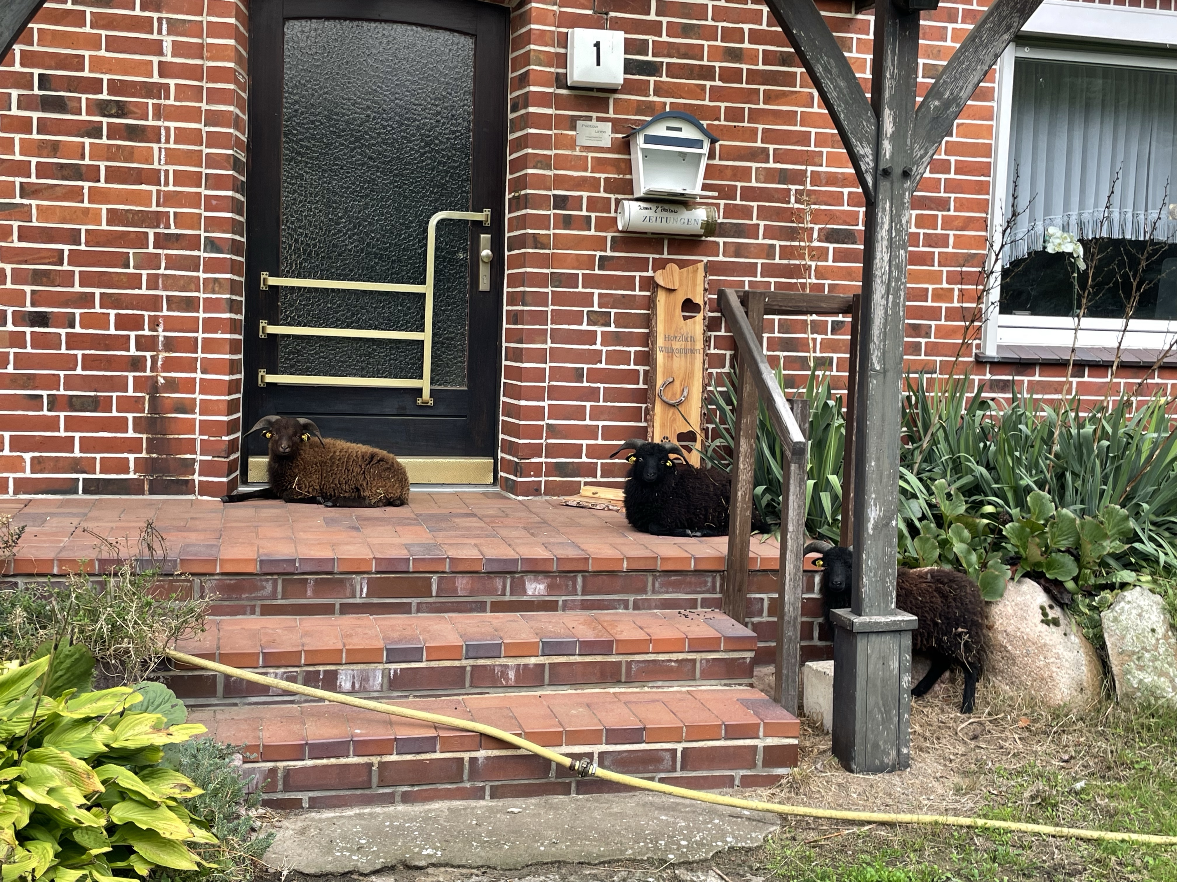 Wir haben sechs Bretonische Zwergschafe. Die meiste Zeit meines Lebens liebe ich sie, aber Schafe sind überhaupt nicht so wie vermutet. Ich dachte es sind muntere, etwas dumme, aber gutmütige und liebe kleine Rasenmäher. Sie sind weder dumm noch gutmütig. Raffinierte kleine Biester, die tatsächlich ziemlich schlecht mähen. Sie finden jedes Loch im Zaun und wollen immer nur da hin und essen, wo sie nicht sollen. Hühnerfutter schmeckt natürlich deutlich besser als Gras und wenn das schon verboten ist, dann kann man wenigstens stiften gehen und entweder beim Nachbarn auf dem Feld die jungen Triebe verzehren oder eben ganz die Weide hoch rennen und da am Feldweg Fußgänger belästigen. Sie sind sehr zahm und wissen ganz genau wo sie sein sollten und wo nicht. Dazu ziemlich garstig anderen Tieren gegenüber. Sie boxen eigentlich alles aus dem Weg. Hunde, Katzen, Kaninchen, Hühner. Nur vor den Pferden haben sie zum Glück einen gewissen Grundrespekt. Sie dürfen bei uns zum Beispiel nicht mehr auf den Hof, sondern nur oben auf die Weide. Zum einen weil sie das Hühnerfutter fressen (was schädlich für Schafe ist!), zum anderen weil ihn der Hof nicht reicht. Wenn sie auf dem Hof sind, wollen sie auch auf die Straße oder mit in den Wintergarten. Sobald sie im Wintergarten sind wollen sie in die Küche… Ich hätte nicht mal dagegen was einzuwenden, aber sie pinkeln überall hin und am liebsten aufs Sofa. Wenn die Schafe einen Weg ins Haus gefunden haben, findet man auch immer beweise des Einbruchs… Wir hatten den Heizungsraum mal offen stehen und sie sind durch den Heizungsraum bis in die Küche der Ferienwohnung vorgedrungen… Wie gesagt an den meisten Tagen liebe ich sie und hin und wieder sind sie zu verschenken.